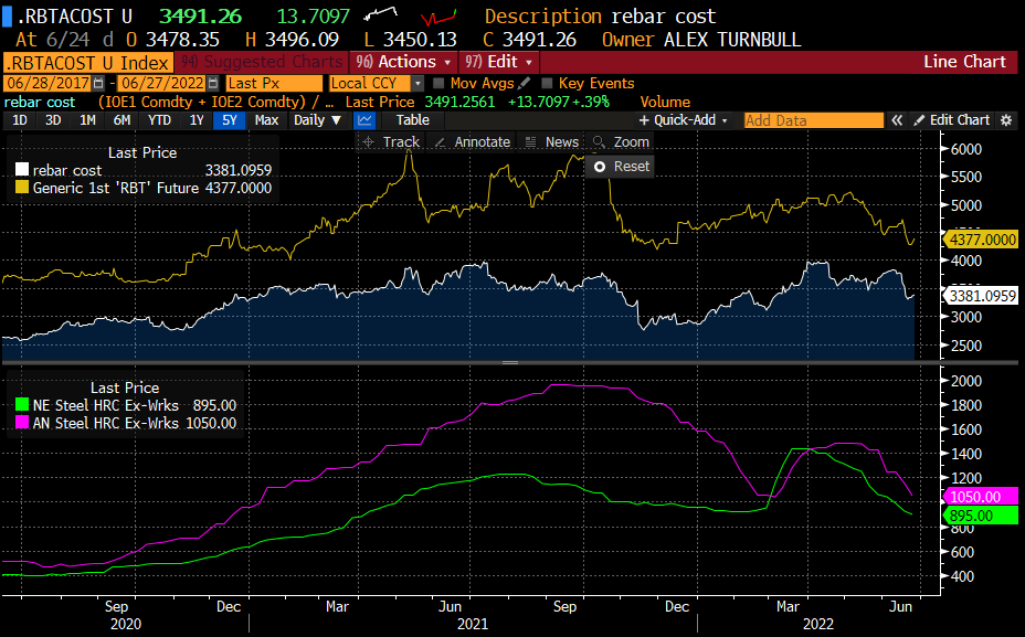 China now is buying more coal from Mongolia and its coking and thermal prices have now dropped to levels last seen prior to the Ukraine invasion. This trend is not stopping in fact recent news of automated borders, rail and the like indicates it will continue. Steel in a blast furnace takes two principal inputs: iron and coke from coking coal. Both have dropped recently but coking coal has a genuine supply shock incoming from Mongolia and for seaborne, reduced imports. This is taking a simple cost index for steel much lower and depending on how much China’s real estate sector slows iron could well follow leaving steel prices back at prices last seen in 2015-2016. For now China steel futures in yellow are tracking costs lower and North American European prices are following.