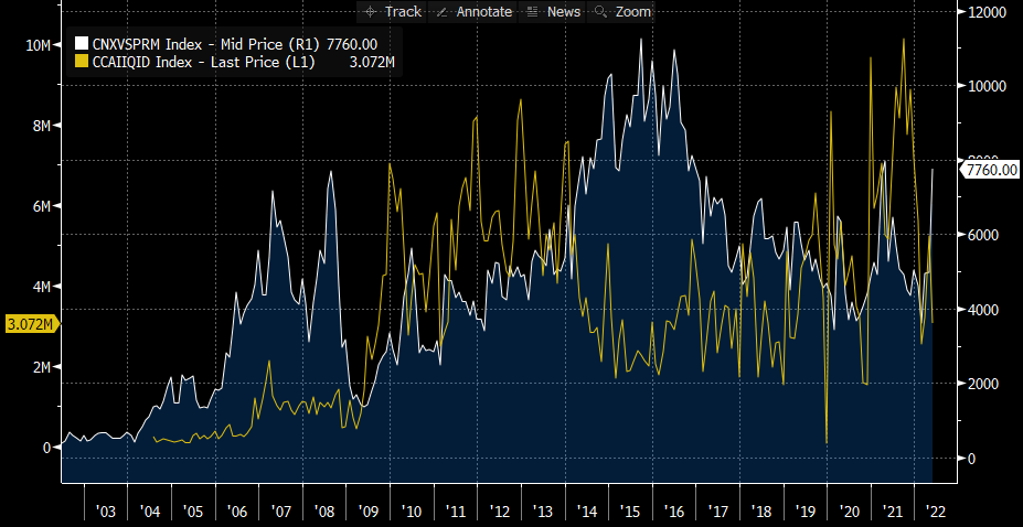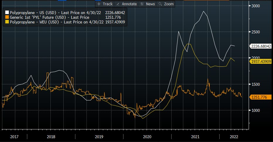 China helpfully has a liquid futures market for key plastic resins that make up much of global plastics production that can be readily compared to international prices. Something is clearly going on right now: China prices are collapsing, US prices are up, but not absurdly so and Europe is suffering a terrible price shock because gas is a key input. The underlying cause is the Ukraine invasion: China can import cut price gas and crude from Russia, the US uses local gas and crude and Europe pays obscene prices for whatever Russian gas it can still get. Prolypropylene goes into everything and has wildly different prices globally which as not happened before (Europe in yellow, US in white, China futures in orange).