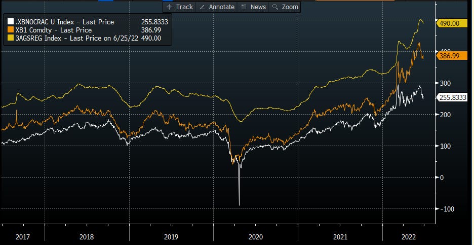 China has a major opportunity here to signal a diplomatic switch which astute China watchers are seeing in some personnel changes in the Chinese government. China has a genuine oversupply of refining capacity and until 2021 was a major exporter of refined products like diesel and gasoline. The pain at the pump in the US is as attributable to genuinely tight crude markets as it is to a squeeze in refining capacity especially in Europe which has led to Europe importing those products from the US in turn spreading the pain. This can be seen in the “crack spread” or the difference between refinery outputs - gasoline, diesel and the like - and oil, the refinery input. Below are retail gas prices in yellow in cents, futures prices for gasoline in orange and gasoline without the crack spread in white. A normalization in spreads would take gas down to 310c or so - or barely above the pre Ukraine conflict pricing.