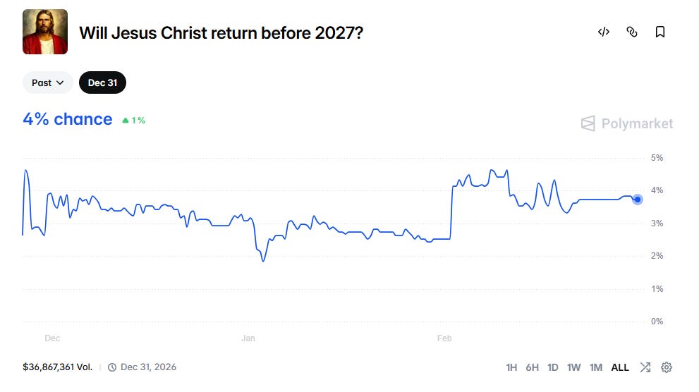 Before you laugh or cry - let’s explore this a little and “steel man” this behavior. If you believed that you were indeed going to the war to end all wars, then being offered a 25x return on the second coming would be a compelling bet. Then there is the question that if you indeed believe that and that you are entering the kingdom of heaven or being thrown into a lake of sulfur, what is the point of gambling? You cannot spend your winnings because either way you will not need them. If you do not believe this then bet against the second coming and get it wrong your losses are hardly the worst of your troubles. There is a nasty in-between state of the US becoming a klepto-theocratic state that threatens private businesses and which might interfere with market integrity here - Trump declared Jesus or some such. That is why I will not bet on this Pascals wager like proposition.
